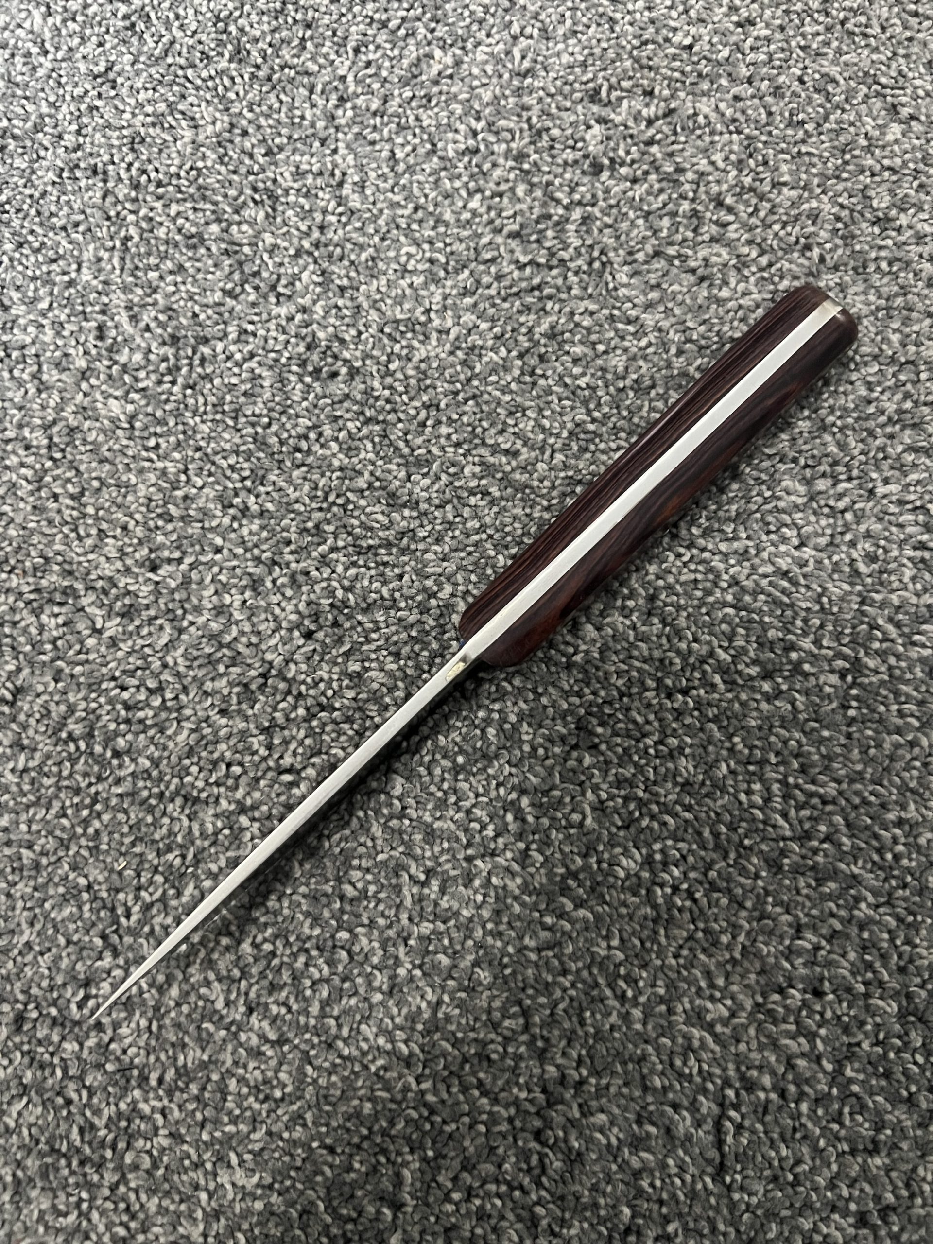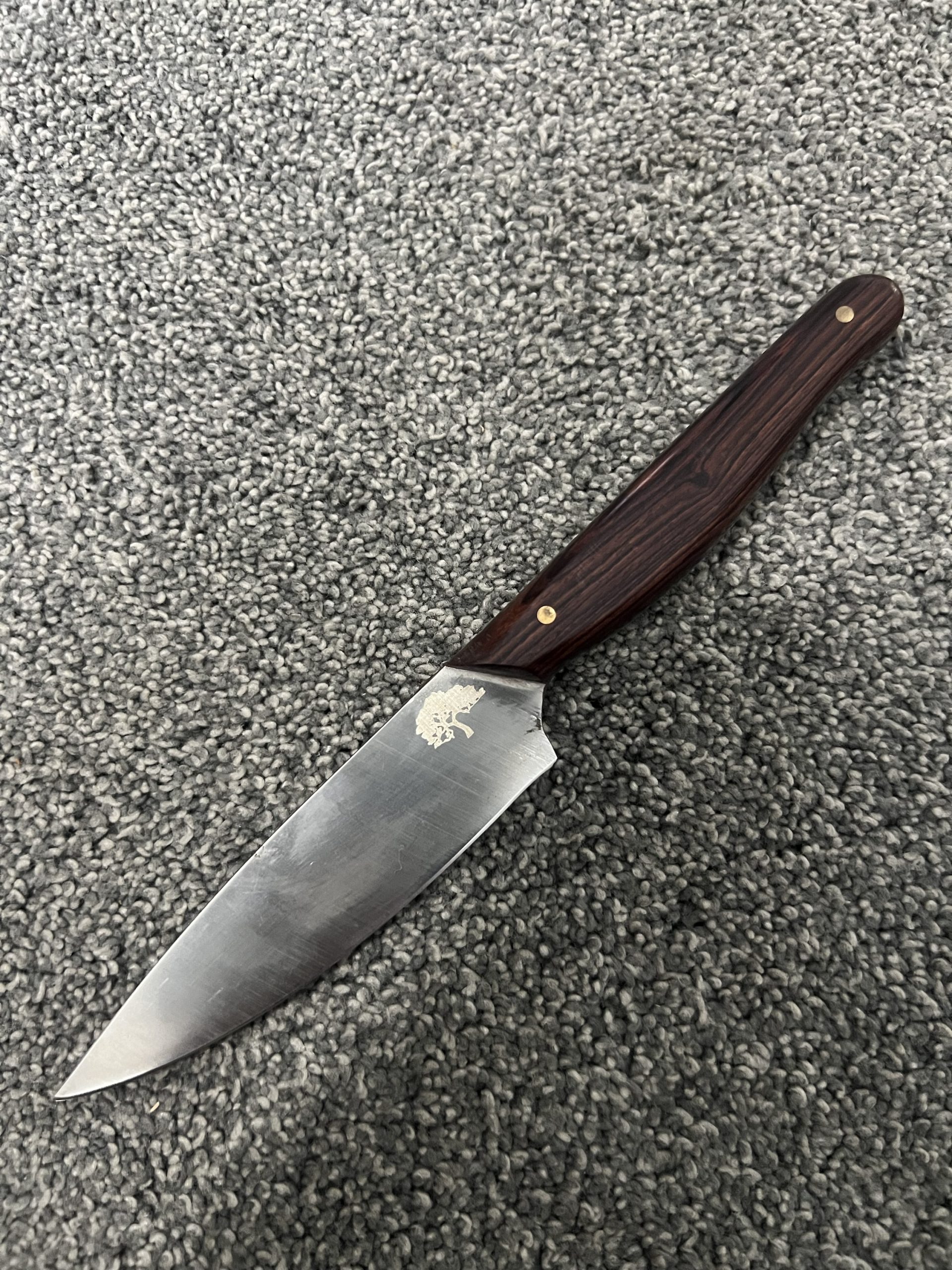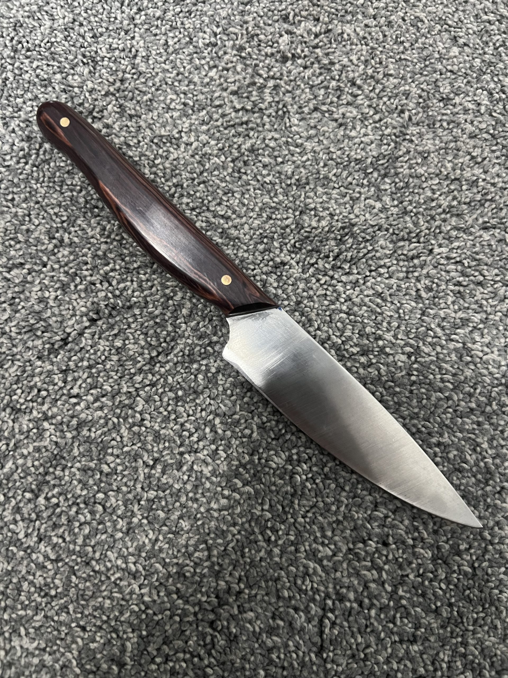 Kiran’s Koa paring knives. These were designed for my wife originally as a paring/steak knife but quickly realized that a little redesign would make it pretty optimal as a carry knife as well. Blade steel is AEBL stainless hardened to 60-62 HRC. These should not really rust or patina, but are also not dishwasher safe. Best practice to hand wash the blades with soap and water. Handles should not be soaked in water or exposed to too much water in general. All handle material is stabilized or naturally very stable. These blades are not perfectly mirror polish and do come with surface imperfections. These knives are designed in that way as they are meant to be used. All blades are shipped with a leather sheath.