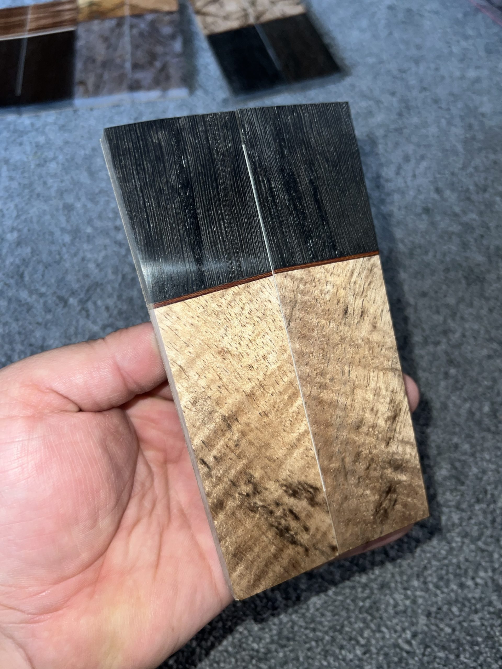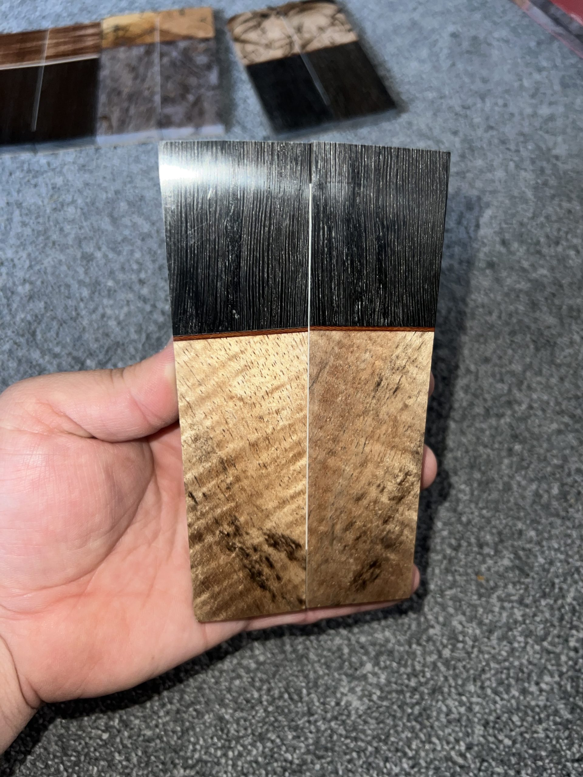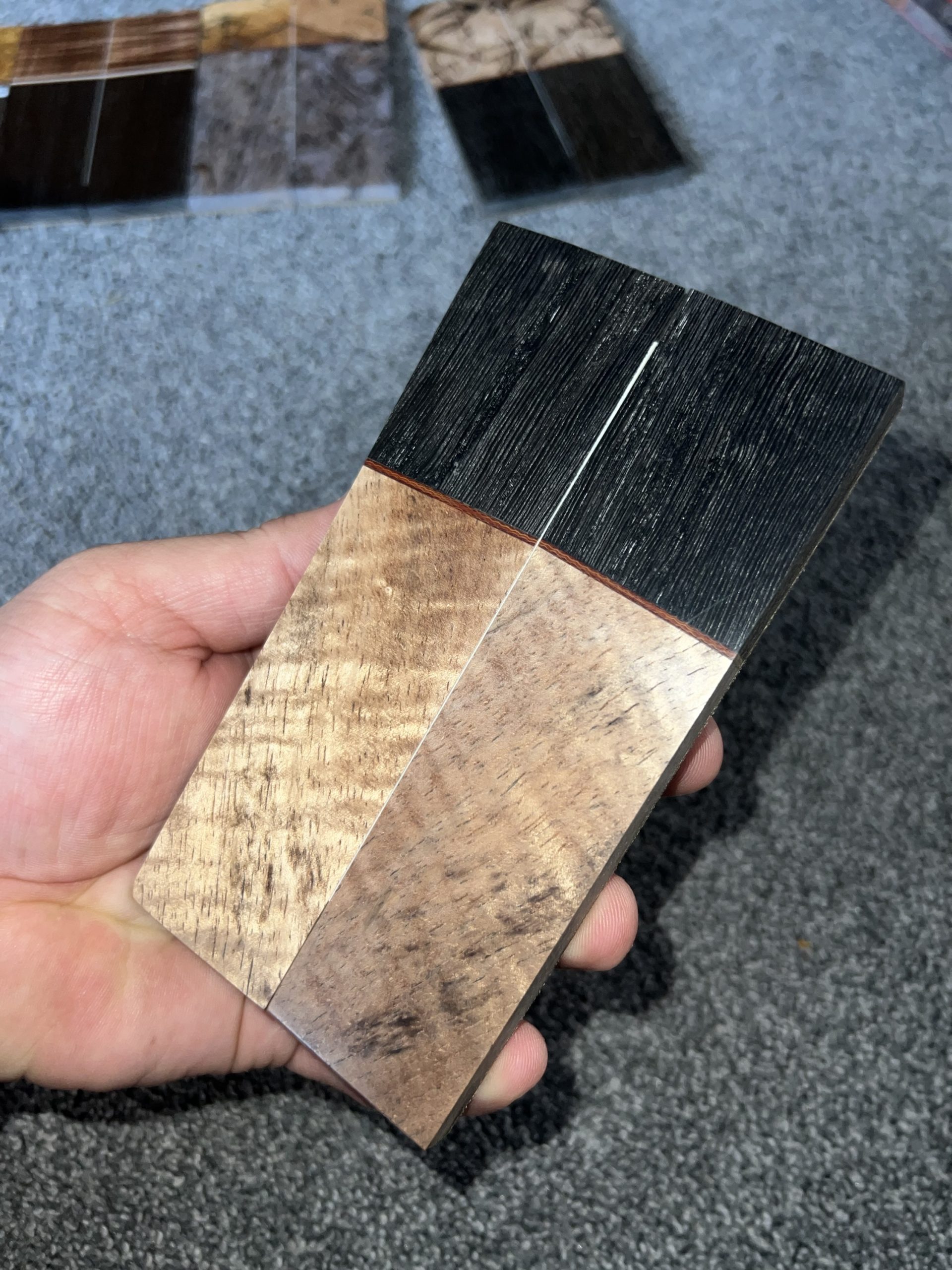 Simple segmented scale set! Made with curly Koa and ancient bog oak! Backed with Westinghouse micarta and epoxied with west systems epoxy! All materials are Professionally stabilized by K&G!! Spacer is also Westinghouse micarta.