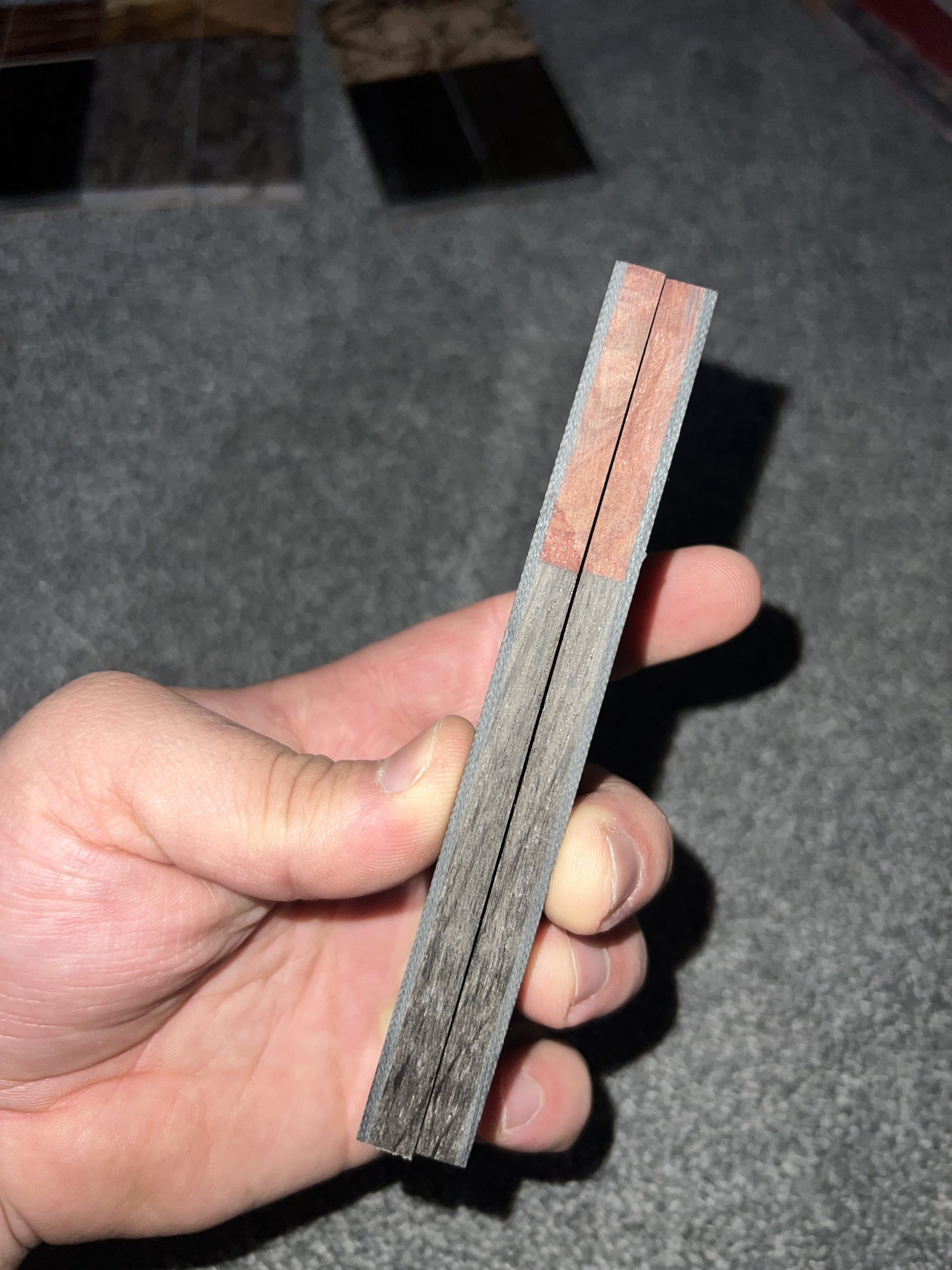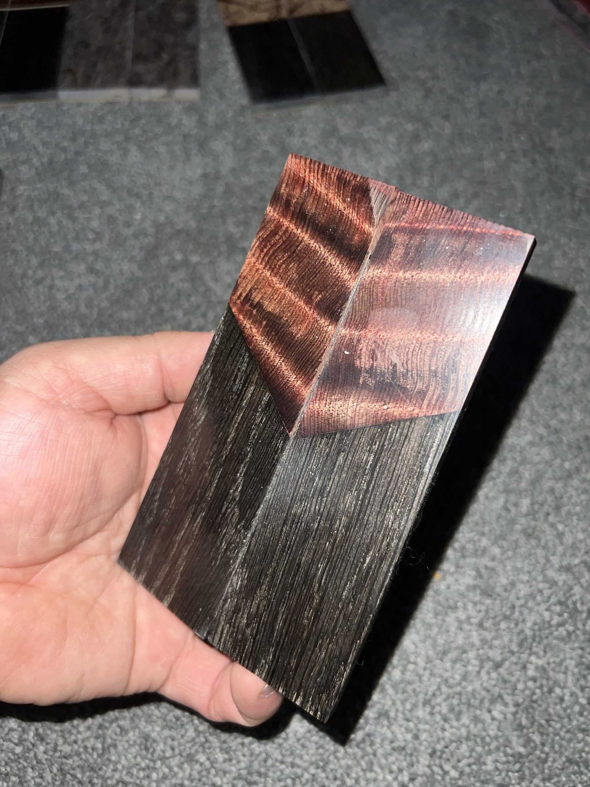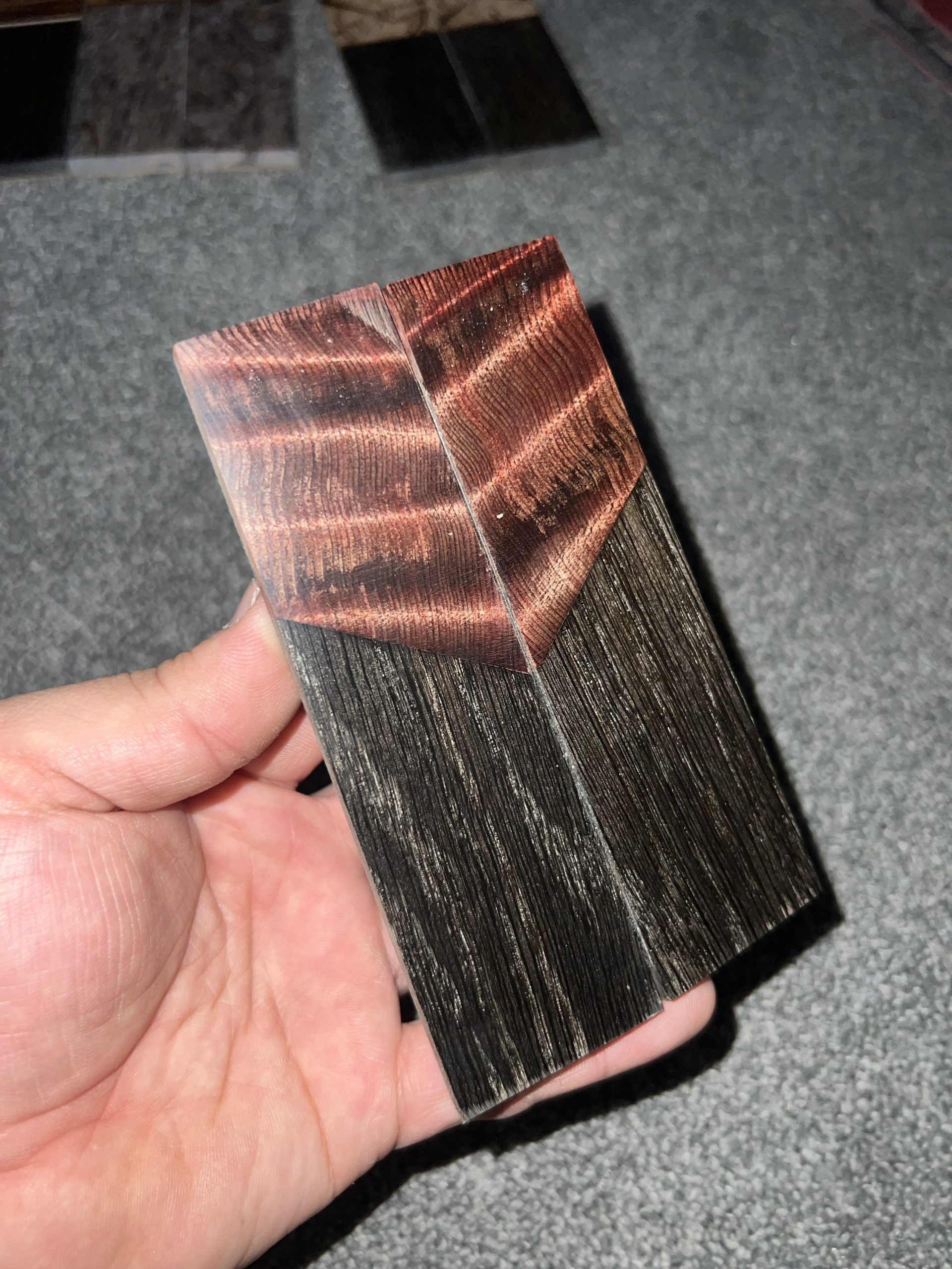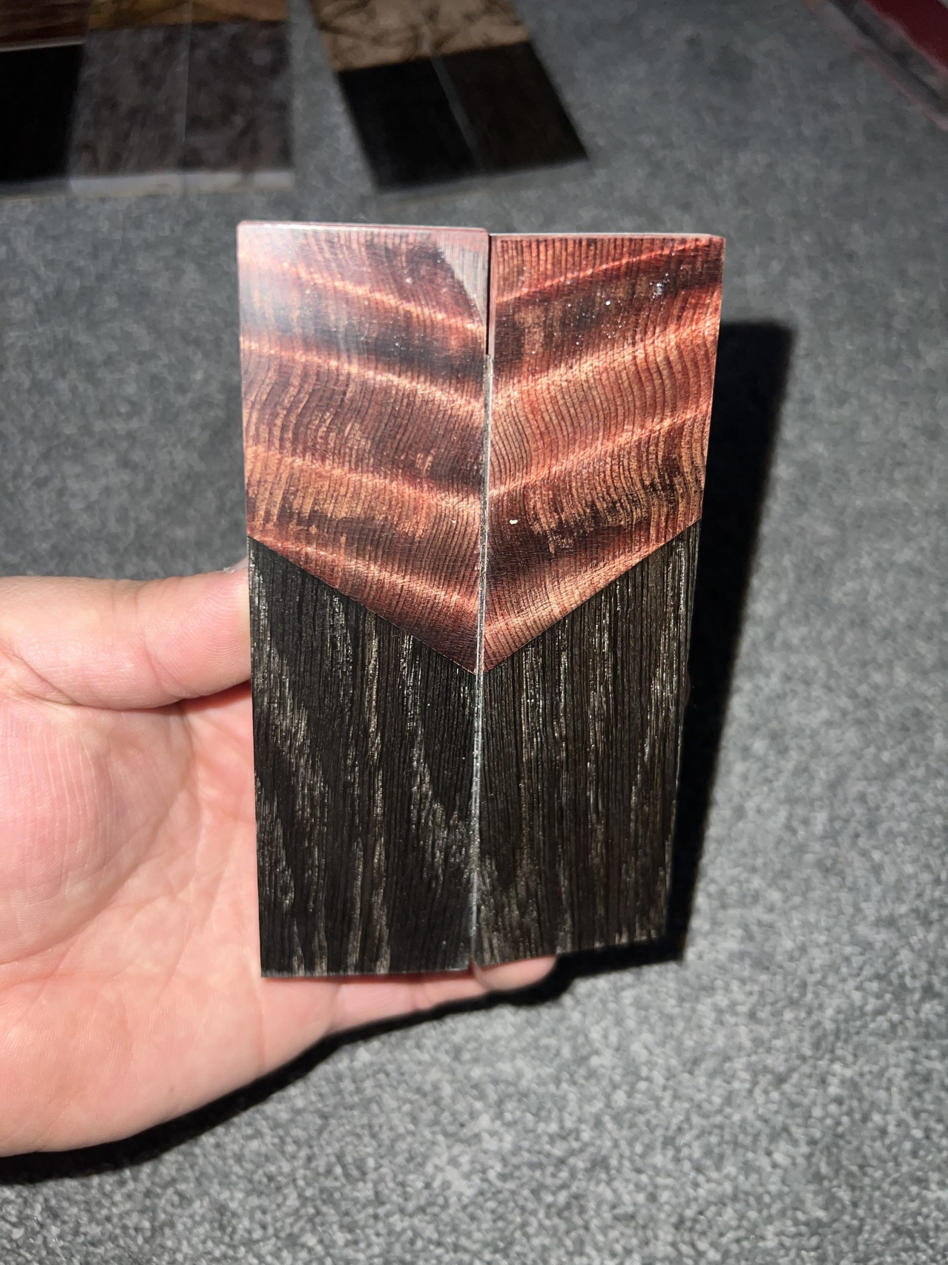 Dyed curly redwood and ancient bog oak segmented scales! Backed with black G10 and epoxied with west systems epoxy! All materials are Professionally stabilized by K&G!!