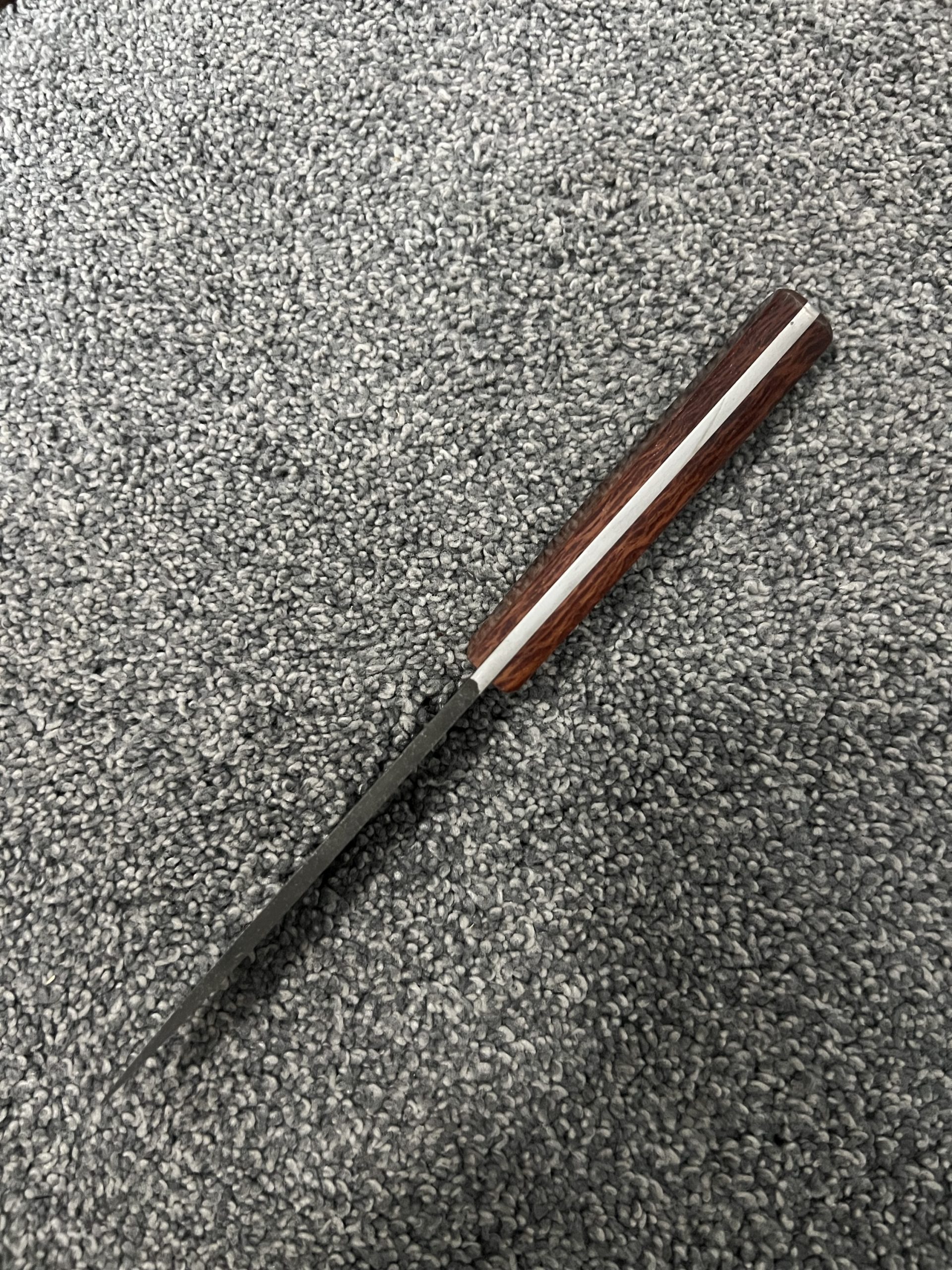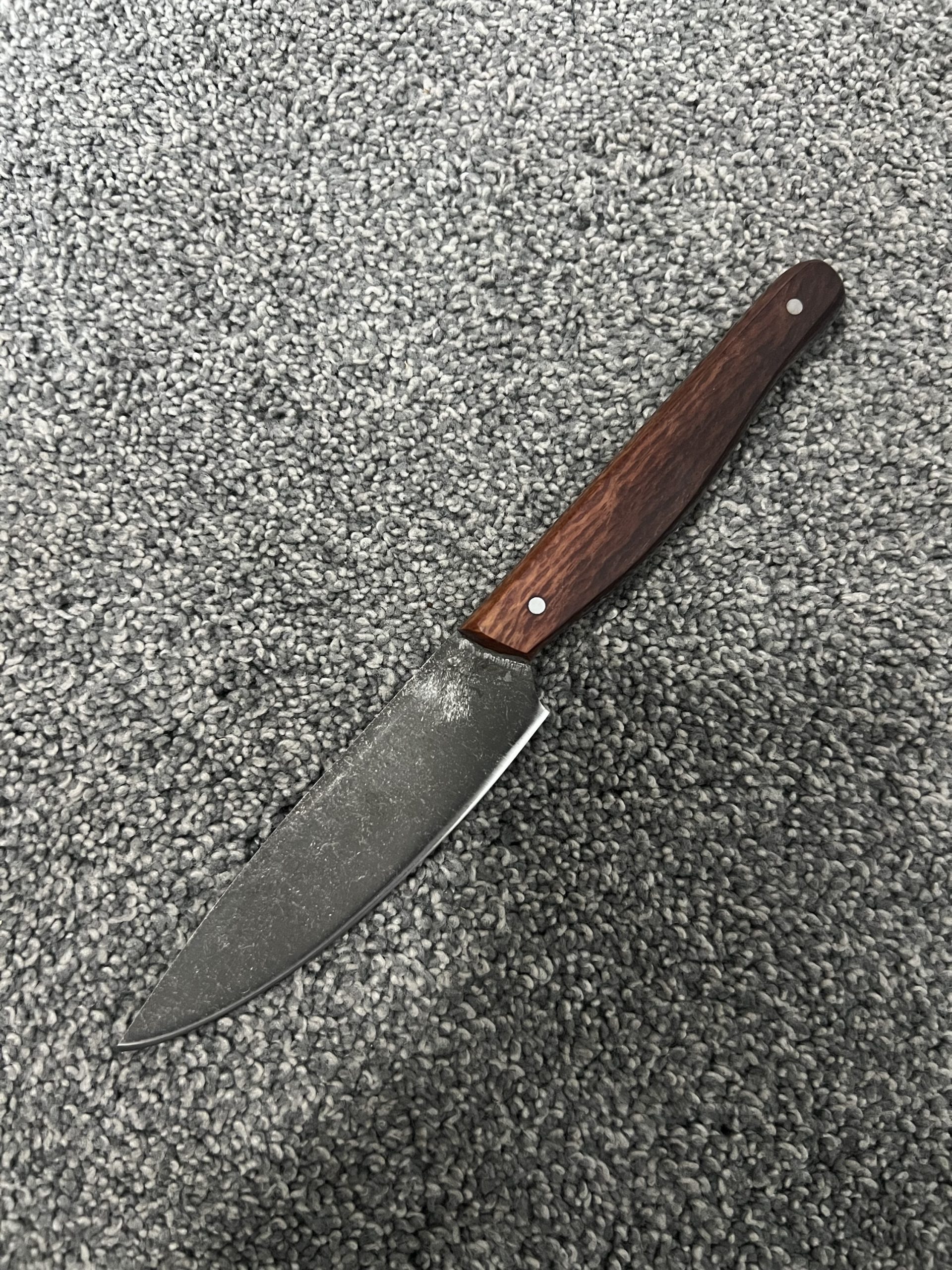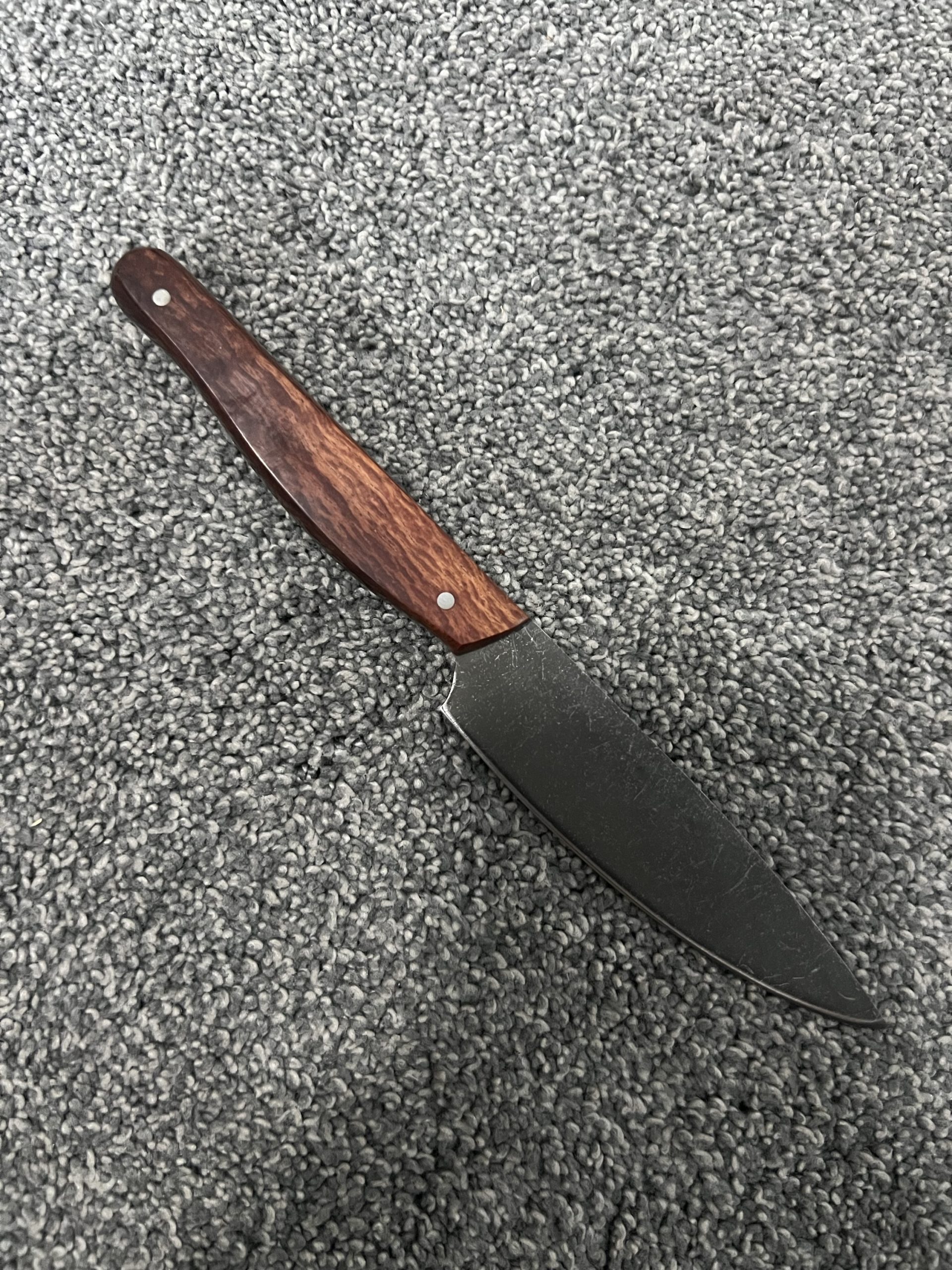 Kiran’s Koa paring knives. These were designed for my wife originally as a paring/steak knife but quickly realized that a little redesign would make it pretty optimal as a carry knife as well. Blade steel is AEBL stainless hardened to 60-62 HRC. These should not really rust or patina, but are also not dishwasher safe. Best practice to hand wash the blades with soap and water. Handles should not be soaked in water or exposed to too much water in general. All handle material is stabilized or naturally very stable. These blades are not perfectly mirror polish and do come with surface imperfections. These knives are designed in that way as they are meant to be used. All blades are shipped with a leather sheath.